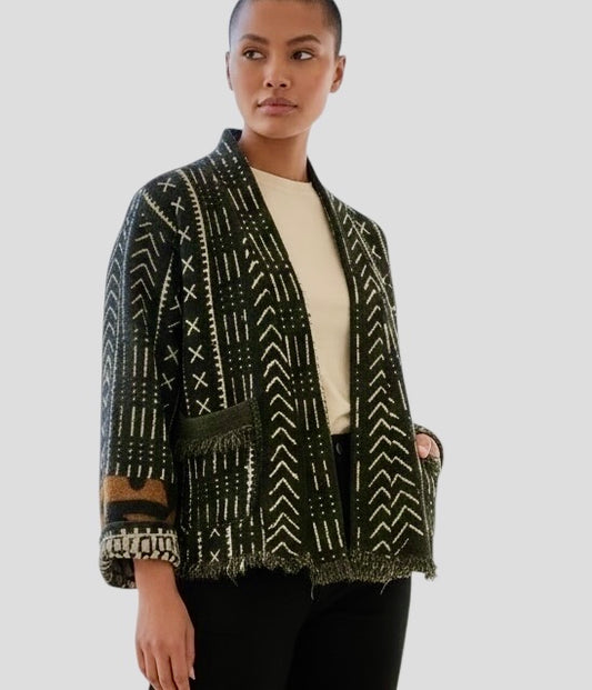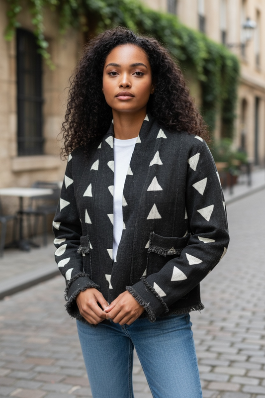 CROPPED JACKET black w white print brown sleeve insert size medium